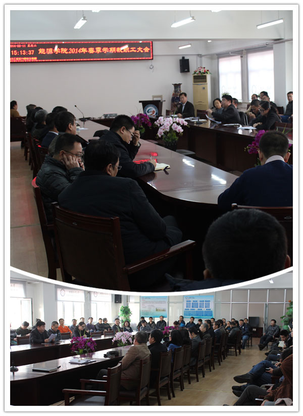 2014年3月11日下午15:00,350vip8888新葡的京集团在动力楼619会议室召开全院教职工大会,布置新学期工作。院长赵广播,院党委书记张桂芬,副院长李炳熙、王洪杰、陈浮、党委副书记苑颖及350vip8888新葡的京集团全体教工参加了本次会议。