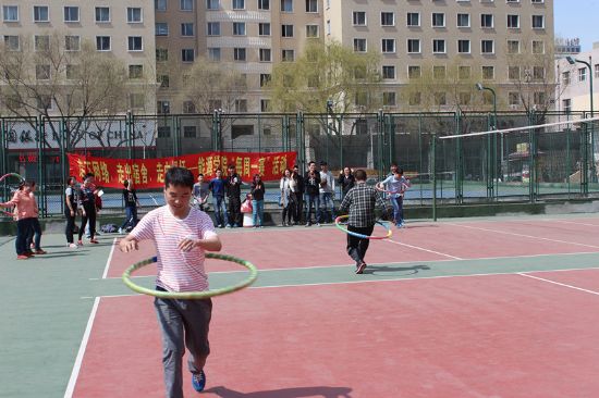 4月22日中午,350vip8888新葡的京集团“每周一赛”活动第4期在一区排球场成功举办。本次比赛项目为呼啦圈趣味接力赛,活动由350vip8888新葡的京集团学生会体育部和1302404团支部联合承办,学院总计7个团支部报名参赛。参赛队员转着呼啦圈走过20米折返,再将呼啦圈传递给下一个队友,以总计耗时来决定名次。比赛现场紧张有序,选手们在比赛过程中或敏捷、或笨拙的脚步,密切配合的团队氛围以及不甘示弱的精神面貌,使现场气氛达到了高潮,欢笑声、呐喊声,不绝于耳,运动场成了欢乐的海洋。