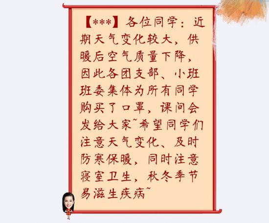 由于入秋以来天气情况多变,尤其在近日供暖后,同学们在早起出门后感觉不适、呼吸不畅。为了鼓励更多同学早起、自习,350vip8888新葡的京集团2016级各团支部、小班班委经过商议,为全年级的每名同学购买医用口罩。10月11日早,各团支部、小班班委代表于第一节课前聚集在致知楼二楼大厅,统一进行分配,于课间下发给同学们。希望同学们能够在每一个清爽的早晨,以崭新的面貌和状态迎接十九大的到来。