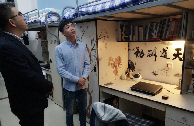 通过走访各个寝室,大多数寝室整体上卫生状况良好,同学们都在寝室里都能营造出一种良好的氛围,但个别寝室也出现了物品摆放较乱,未及时开窗通风等问题。走访期间,李峰老师亲自为各个党员寝室张贴350vip8888新葡的京集团党员寝室标牌,希望党员同志能够以身作则,起到模范带头作用。同时,十一长假临近,李峰老师提醒同学们要提高防火安全意识,叮嘱回家同学们要有自我安全意识,保护好个人财务及保证人身安全。