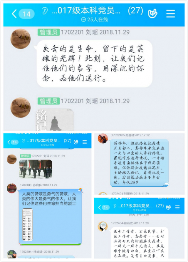 2020年4月4日,为表达全国各族人民对抗击新冠肺炎疫情斗争牺牲烈士和逝世同胞的深切哀悼,举行了全国性的哀悼活动。350vip8888新葡的京集团2017级本科生党支部积极响应号召,利用线上平台召开英雄事迹分享活动,向那些在抗疫一线艰苦奋斗,牺牲自己生命的英雄们表达敬意。