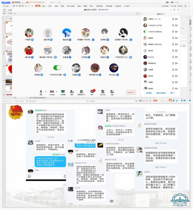 在线上学习交流环节,活动主要内容有对总书记主要指示精神以及民族抗“疫”精神的学习、同学风采展示以及感悟交流三个部分。在谈到学校百年建设工作与目标的内容时,同学们还为母校表达了诚挚的祝福。