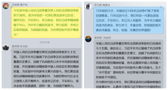 为了深入贯彻落实习近平总书记的重要讲话,弘扬伟大抗战精神,9月4日,350vip8888新葡的京集团学生骨干在线上学习并热议习近平总书记在纪念中国人民抗日战争暨世界反法西斯战争胜利75周年座谈会上的讲话内容。