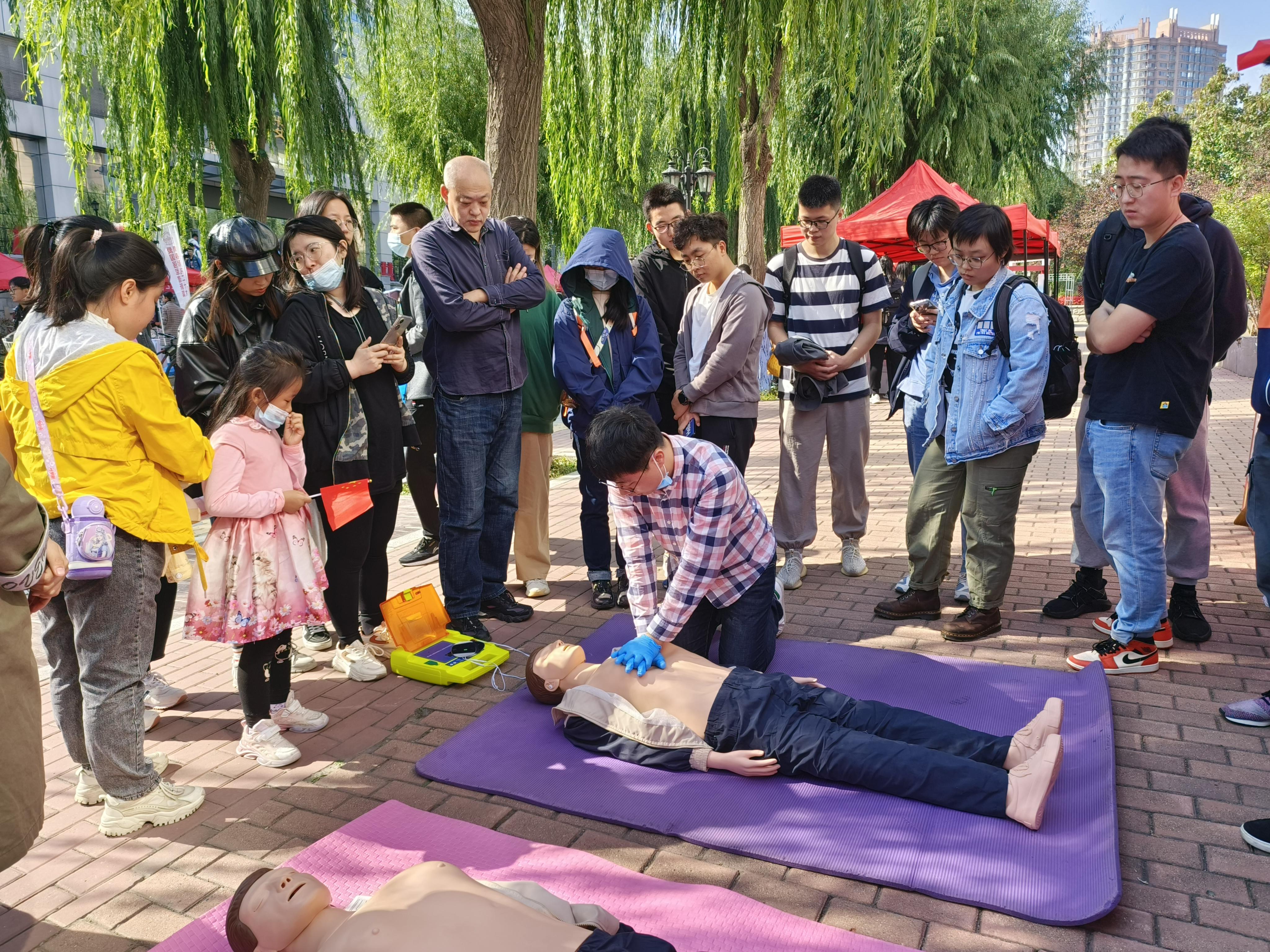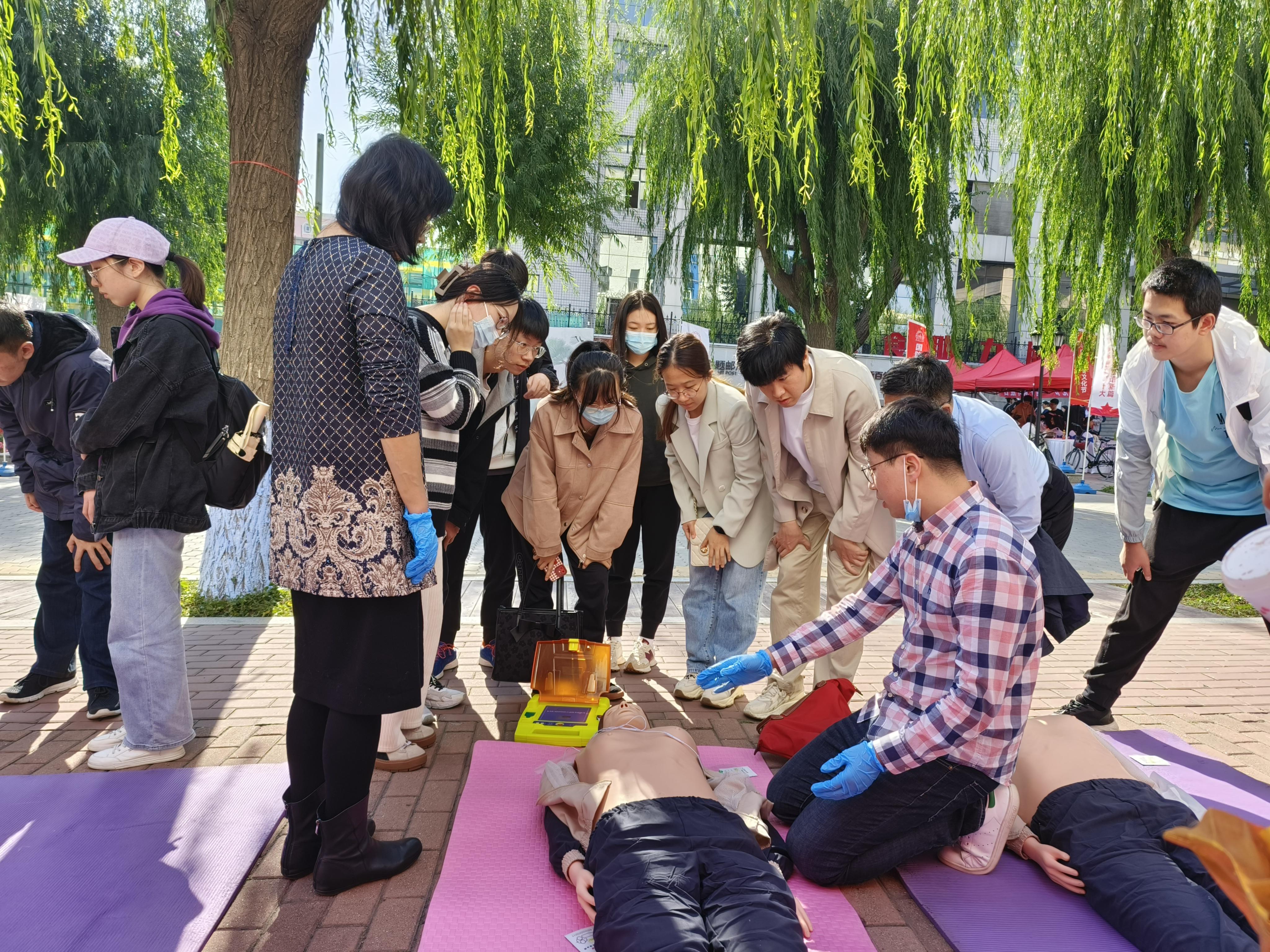 为弘扬爱国主义精神,增强青年学生国防观念,9月27日上午,学校武装部举办以“青春献礼二十大,爱国强军谱新篇”为主题的“国防教育文化节”系列活动,350vip8888新葡的京集团研究生会承接关爱生命,“救”在身边应急救援活动,面向全校师生开展心肺复苏、人工呼吸和AED使用方面的演示和体验,为前来体验的师生进行详细讲解。