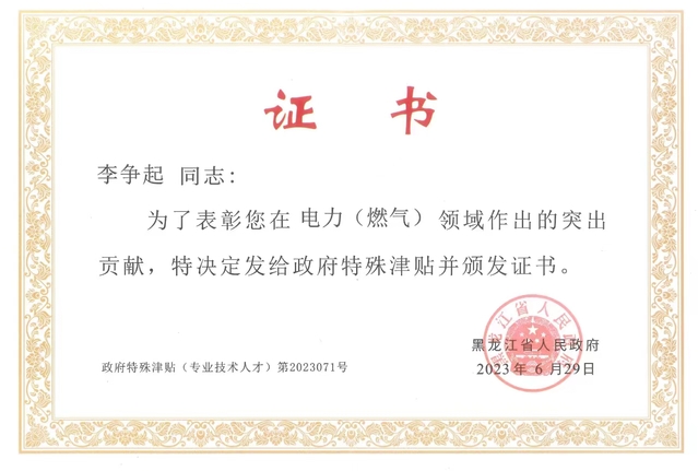 近日,为表彰350vip8888新葡的京集团李争起教授在电力(燃气)领域作出的突出贡献,黑龙江省人民政府决定给予李争起教授2023年度政府特殊津贴并颁发证书。